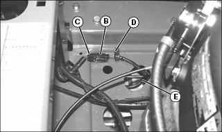 2. Remove clutch wiring harness from retaining clip (D), and lower harness and connector (C) through hole (E).