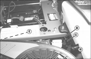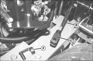 • Remove locking pin (F) on yoke end (G), then remove yoke end from arm (H). Turn black yoke end on rod (D) in (clockwise) to decrease forward creep and out (counterclockwise) to decrease reverse creep. Repeat procedure, as necessary, on opposite side (E). Install yoke ends back onto arms and secure with locking pin.