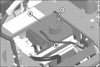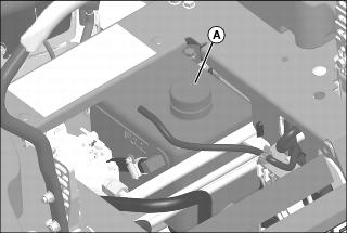 2. Raise operator’s seat, and clean area around reservoir cap (A). Remove cap.