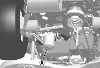 3. Clean area around hydraulic oil filter (B).