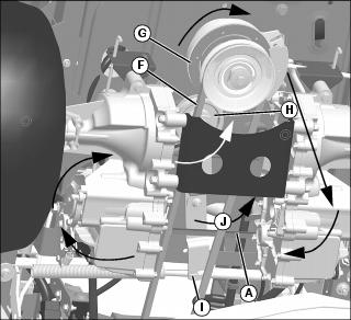 • To make removal and installation of the belt easier, carefully rotate the spring loaded idler (I) counterclockwise (J), and remove belt.