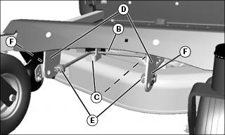 6. Install front draft rod (B) onto mower deck bracket (C) and onto draft bracket (D). Secure stud ends (E) with locking clip (F).