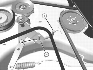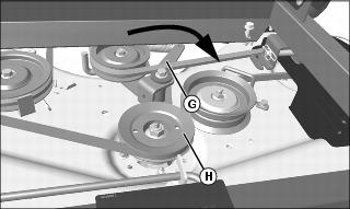 • Install 3/8-inch ratchet onto square hole (G) in tension arm and rotate clockwise to release tension on belt, while installing mower belt onto center spindle sheave (H). Make sure belt is properly seated on all sheaves.