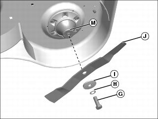 2. Position mower blade (J) with cutting edge toward ground onto mower spindle.