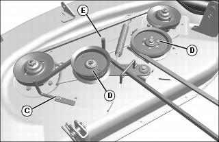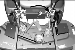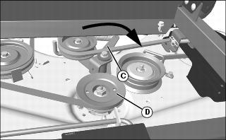 • Install 3/8-inch ratchet onto square hole (C) in tension arm and rotate clockwise to release tension on belt, while removing mower belt from center spindle sheave (D).