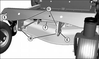 7. Remove locking clips (E), and remove front draft rod (F) from draft bracket (G) and mower deck bracket (H).