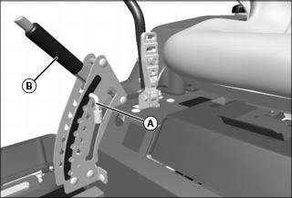 4. Remove pin (A), lower mower deck, and install pin just above lever (B) to lock mower in lowered position.