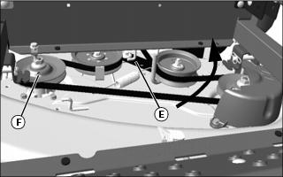 • Install 3/8-inch ratchet onto square hole (E) in tension arm and rotate counterclockwise to release tension on belt, while installing mower belt onto left spindle sheave (F). Make sure belt is properly seated on all sheaves.