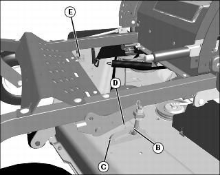6. Install side draft rod (B) onto mower draft bracket (C). Secure with spring locking pin (D). Repeat on opposite side (E).