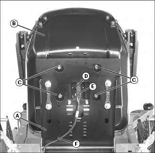 4. Plug wire harness connector (E) into switch. Route harness on bottom of seat and secure harness retainer (F) into hole in seat platform.