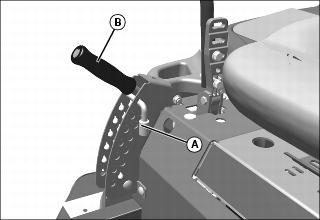 1. Be sure mower is fully raised to the transport lock position, as shown, and insert the pin (A) in the hole just below the mower deck lift lever (B).