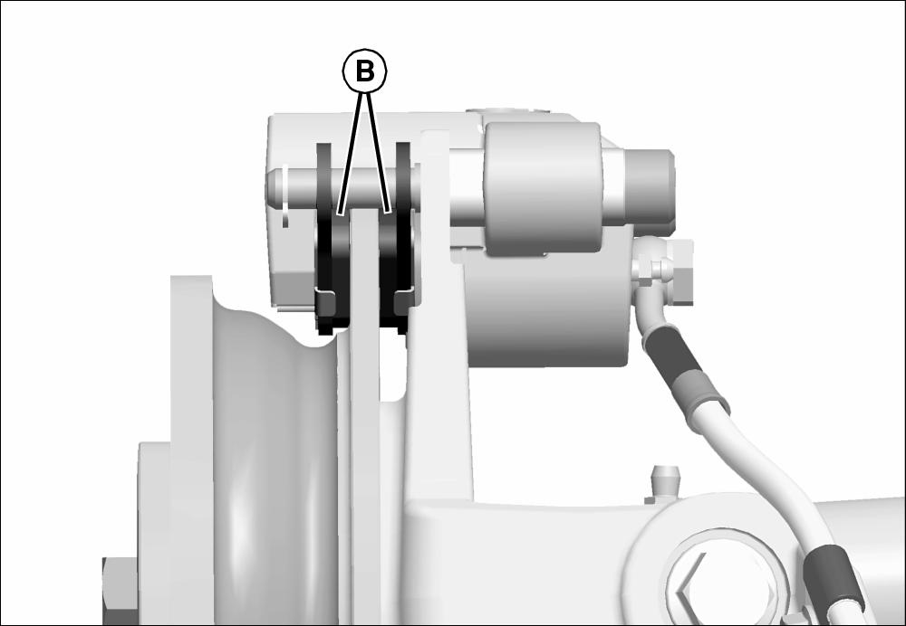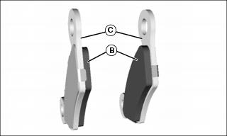 5. Inspect brake pad’s friction material (B) for wear or damage. Check each pad’s friction material thickness: Minimum specification should be 1 mm (3/64 in.) between the inside edge (C) of the backing plate and the wear surface of the pad. If below this specification or brake pad friction material is damaged, see your John Deere dealer for replacement service.