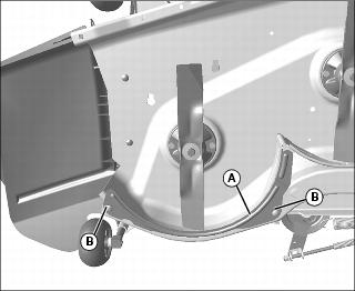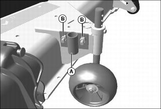 1. Install front mounting bracket (A) on mower deck right front gage wheel bracket with two M8x25 bolts and M8 locknuts (B). Tighten to 20-40 N•m (15-29 lb-ft).