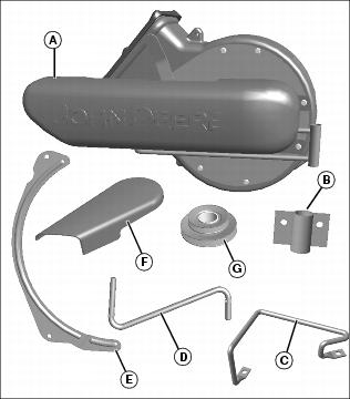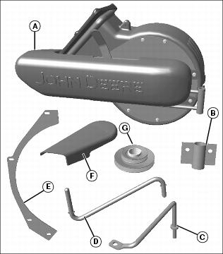 • Install straight end of hinge spring through blower belt shield hole (D). Loop the curved end of hinge spring (C) over the wire form shield support rod.