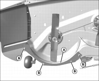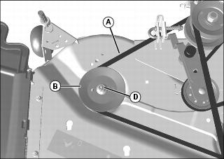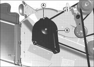2. Remove mower deck belt (A) from right spindle sheave (B). Inspect and replace belt if needed.