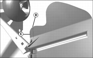 5. Locate embossed cut line (D) on deck discharge chute. Cut along line and remove section (E).
