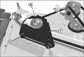 8. Install modified mower deck belt shield (F) into slots (G). Install original bolt (H).