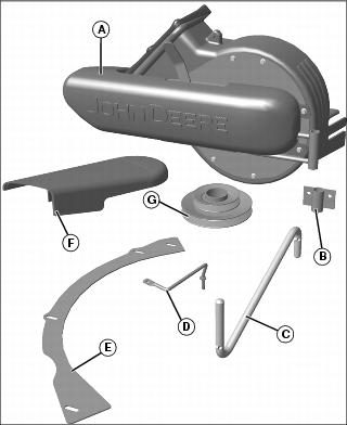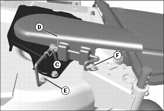 • Install an M6 washer on M6x25 flange bolt (F) and install through opposite end of wire form shield support rod into right rear gage wheel bracket. Install M6 washer and M6 flange locknut on bolt from beneath gage wheel bracket.