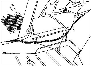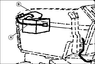 Connect wiring harness extension (A) to fused harness (B) at battery. Make sure the harness passes between the left side hood rods.