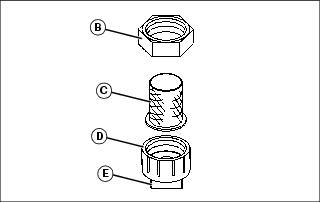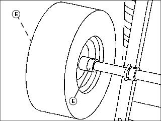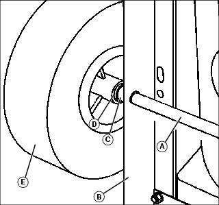 1. Install locking collar (E) and wheel. Secure outside of wheel with second locking collar. Tighten locking collar with a hex key wrench.