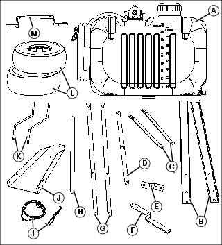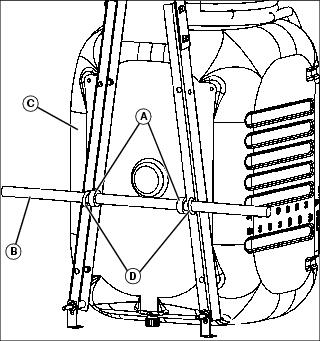 2. Install entire spray boom and support rods through rear holes in tank frame (C).