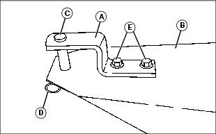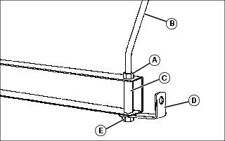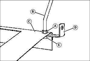 3. Install support (D), 3/8 in. lockwasher, and a second 3/8 in. nut (E). Repeat for opposite side. Boom support hardware: