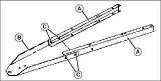 1. With frame rail (A) channels mounted to the inside of the hitch frame (B), align mounting holes in frame rails to mounting holes in hitch frame.