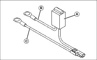4. Remove nut from negative (-) battery cable clamp. Install black lead (C) onto clamp bolt. Install and tighten nut completely.