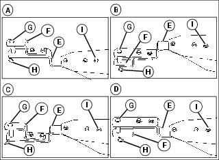 2. Install drawbar extension (E) (to bottom side of hitch frame), hitch clevis (F), hitch pin (G), and spring locking pin (H). Install and tighten hardware (I):