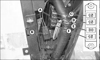 4. Connect the other end (F) of negative (–) booster cable to a metal part of the disabled machine engine block away from battery.