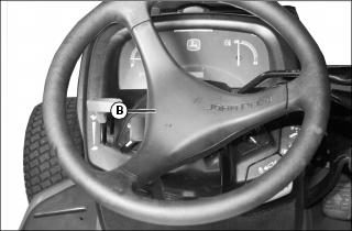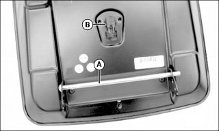b. Install seat on seat suspension assembly (B) by inserting rod through holes in suspension and middle hole in seat pan bracket.