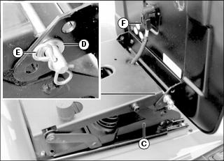 d. Squeeze seat switch tabs together and slide switch (E) into slot in bottom of seat and release tabs. Connect seat switch harness (F).
