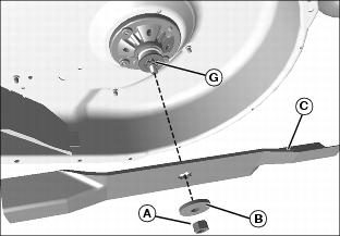 1. Align the splined center hole in the blade (C) with the splined spindle shaft (G) and put the blade onto the mower spindle shaft with cutting edge toward ground.