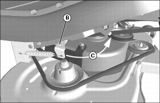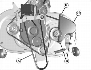 11. Install belt around sheaves (A) and (B) and install on mower deck, as shown. Route belt around any remaining sheaves. Make sure belt is in the groove of each sheave, there is no twist in the belt.