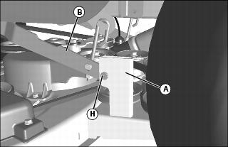 8. Install pin (H) through deck bracket (A) and draft arm (B). Make sure pin installs completely through deck bracket, and secure with spring locking pin. Repeat for other side.