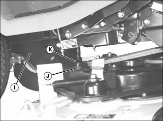 10. Be sure raised opening (J) on blower adapter housing and rubber boot (K) under right side of machine fender deck are clean. Install rubber boot onto raised opening of blower adapter housing.
