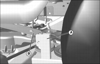 4. Slide mower deck under tractor and line up deck bracket (A) with draft arm (B).
