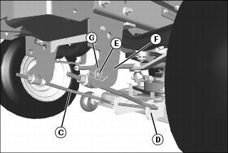 6. Remove spring locking clip and pin (D), and move rear draft arm (E) away from deck bracket (F). Raise deck slightly with deck handle to remove pressure on pin when pulling out. Repeat on other side.