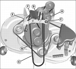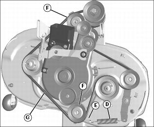 10. Install belt around sheave (F) and install sheave back onto idler arm (D). Install spring (E) and idler arm back onto deck with hardware (C).
