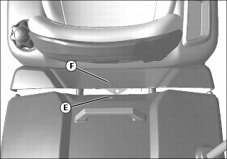 3. With hopper still at an approximate 20? angle, inspect that the center arrow (E) on the hopper aligns to the center arrow (F) on the machine. Move hopper, as necessary, to align the arrows.
