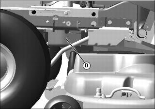 7. Align lower end of discharge chute to fit over mower deck fan outlet. Install discharge chute. Make sure chute stops (D) are against the backplate. Pull on chute to make sure it is properly locked in place.