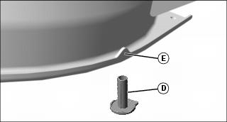 d. Adjust mower level, if necessary, by turning nuts (E) clockwise to raise the side of the mower deck, or counterclockwise to lower the mower deck.