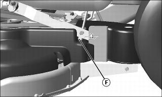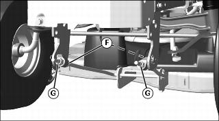 c. Adjust mower level, if necessary, by loosening rear nut (F) equally on each side of front lift rod. Turn front nut (G) equally on each side clockwise to raise front of mower or counterclockwise to lower it. Tighten rear nuts after adjustment is complete.