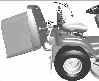 3. Pull handle (A) upward (B) and then forward and down (C) to open grass collector.