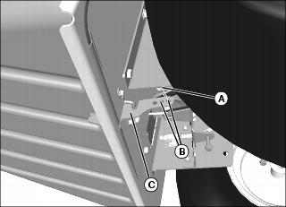 1. If grass collector does not tightly latch closed, move spring (A) onto either hole (B) to increase tension on latch lever (C).