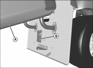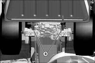 8. Fasten rear of machine at both sides of the axle at points (B) to trailer with heavy-duty straps, chains, or cables. Straps must be directed down and outward from machine.