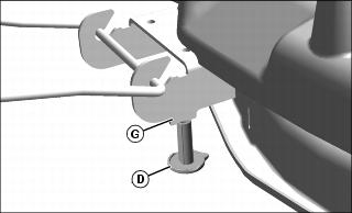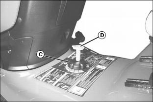 6. Remove the mower deck level gage (D) stored in the mower cutting height knob (C).