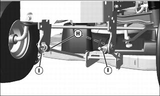 b. Adjust mower level, if necessary, by loosening rear nut (H) equally on each side of front lift rod. Turn front nut (I) equally on each side clockwise to raise front of mower or counterclockwise to lower it until gage just slips under adjustment point 3. Tighten rear nuts after adjustment is complete.