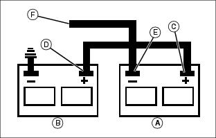 4. Brancher l’autre extrémité négative (–) (F) du câble de démarrage sur une partie métallique du bloc moteur de la machine immobilisée, à l’écart de la batterie déchargée.
