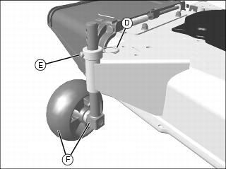 • Retirer l'attache de verrouillage (D), tirer la goupille (E) vers l'extérieur et retirer la roulette et l’axe (F) installés à l’envers sur le carter de coupe. Installer par le bas du carter dans le trou adéquat, comme illustré. Insérer la goupille et l'attache de verrouillage pour verrouiller les roulettes en place.